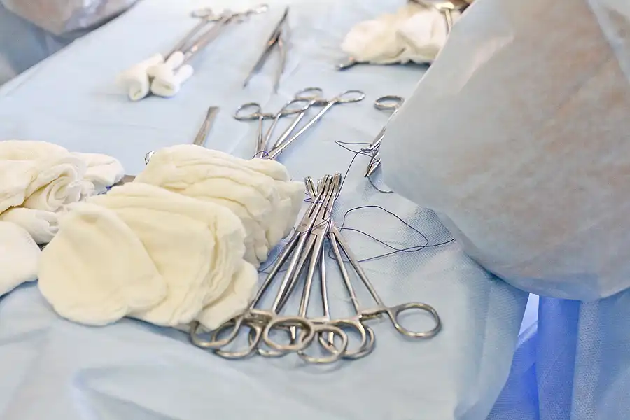 Правую руку кладут на отдельный столик. В руке стоит катетер для физраствора, и уже приготовлен шприц с седативным средством. Последнее понадобится в самом конце операции, а физраствор компенсирует потерю крови.