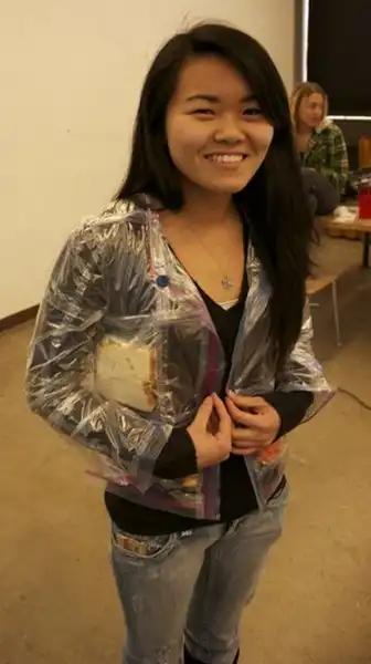 На девушке надет специальный пиджачок для тех, кому лениво тащить на работу пакетик с обедом.