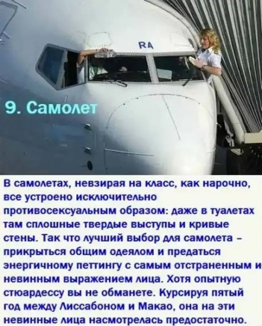 Бля в самолете не трахался , думаю немного потерял , а списочек необычных мест я бы сделал намного длиннее основываясь на личном опыте .
