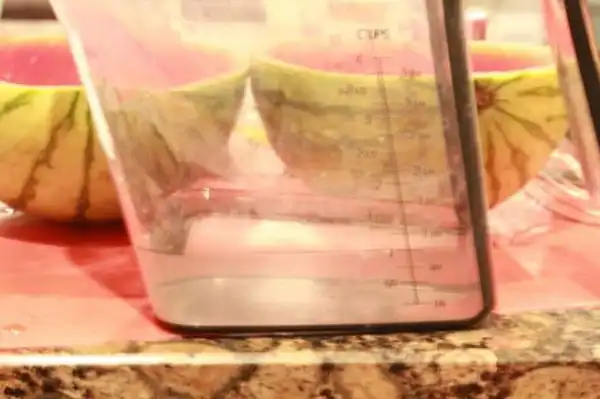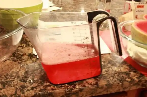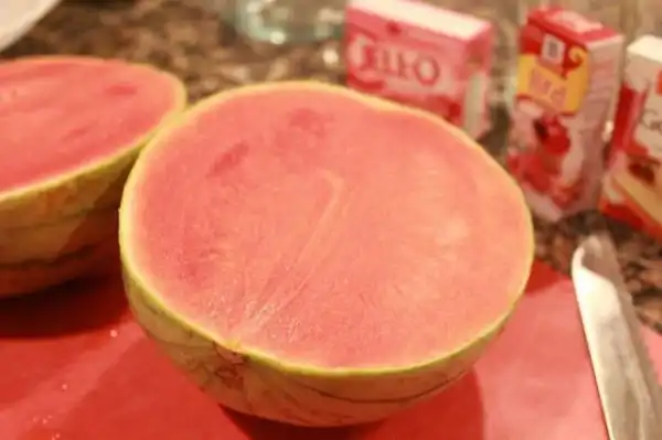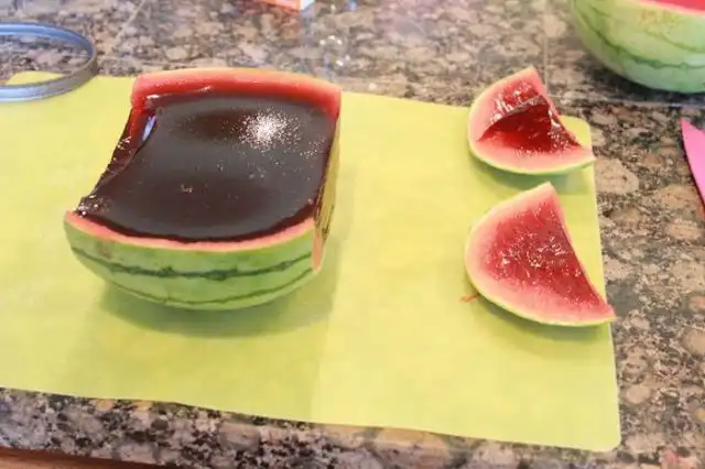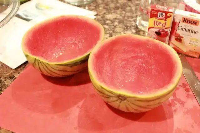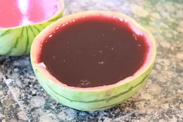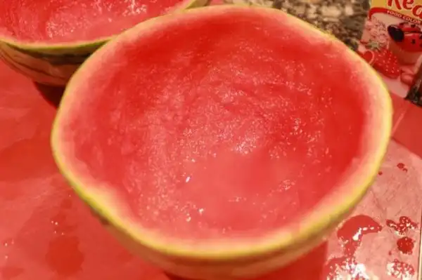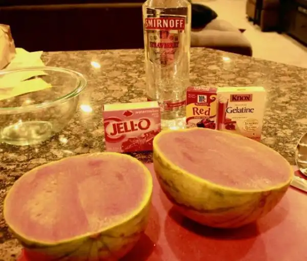 Подогрей воду до состояния кипятка, можно в микроволновке. Разруби арбуз на половинки. Вытащи мякоть арбуза, сделав из него что-то наподобие чаши. Постарайся не наделать дырок. Раствори два пакетика желатина в одном стакане, и два пакетика — в другом. Подожди некоторое время, помешай желатин, чтобы он окончательно растворился. Разлей желатин по половинкам арбуза. Сверху налей по стакану водки. С помощью блендера или миксера измельчи мякоть арбуза, получи сок, профильтруй и добавь в половинки арбуза. Оставь красоту остывать на ночь.