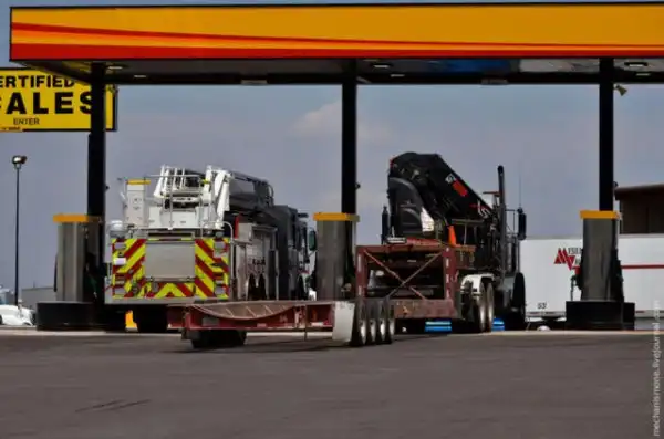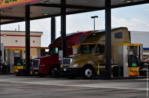 Заправки для дальнобойщиков отделены от заправок для легковых автомобилей. Связано это с тем, что, во-первых, топливные баки грузовиков намного больше, и обычно грузовики имеют два бака по 300-500 литров. Грузовики, которые работают в удаленных от цивилизации местах, например, у нефтяников, могут иметь и по 2 бака ёмкостью 1500 литров. Заправочные насосы таких станций очень мощные, и качают топливо примерно в 4 раза быстрее, чем обычные помпы.