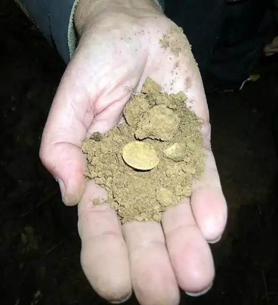 Его первоначальная находка включала ложку и полпенса, но затем прибор показал, что какой-то металл находится под землей. После того, как Уэсли начал копать и вырыл яму глубиной около 15 см, он увидел первую монету, а затем еще 55 солидов — золотые монеты, возраст которых насчитывает более 1600 лет.