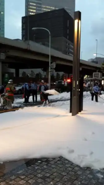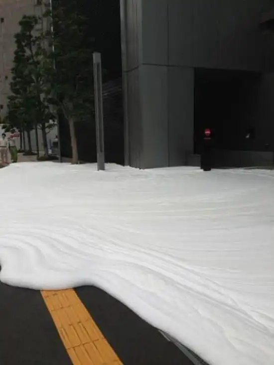 Этот очень необычный инцидент произошел в Токио, а именно в квартале Гиндза, район Тюю. После съемки нового рекламного ролика, сотрудник рекламного агентства решил просто вылить в раковину ненужный гель для душа, которого было ровно 40 литров :)