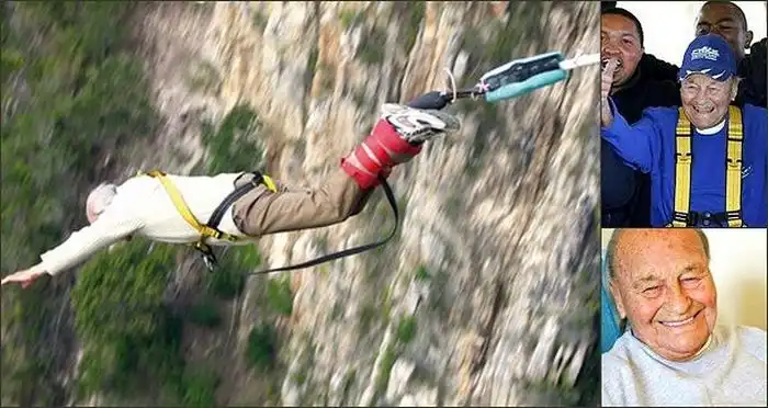 Прыжки на эластичном тросе – один из самых впечатляющих способов поднятия уровня адреналина. Даже молодёжь содрогается при мысли об этом развлечении. 96-летний Мор Кит тоже содрогнулся, однако решился и попал в книгу Гиннеса как старейший человек, когда-либо прыгавший на эластичном тросе. Мало того, Кит не просто прыгнул, а прыгнул с южноафриканского Западного мыса высотой 708 футов.