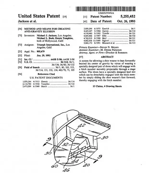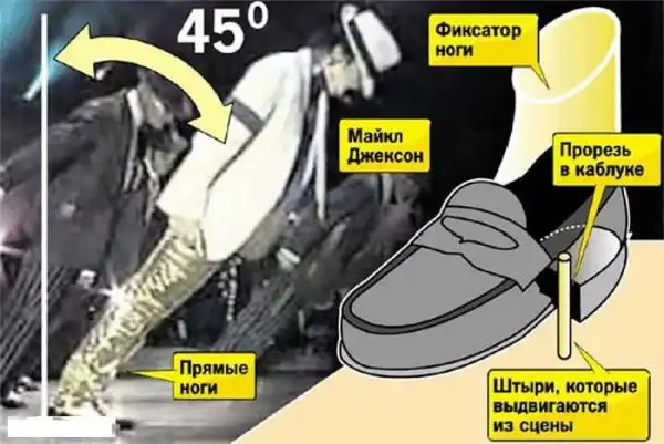 Оказывается, Майкл сам придумал и даже запатентовал специальные ботинки. С виду — обычные, только каблуки высоковаты. В них-то как раз и зарыта собака: там есть треугольная прорезь с фиксатором. В определенное время в нужном месте из пола сцены выдвигались штыри, которые входили в каблук. С их помощью ботинки как бы фиксировались в одном месте и позволяли выгибаться хоть до пола.