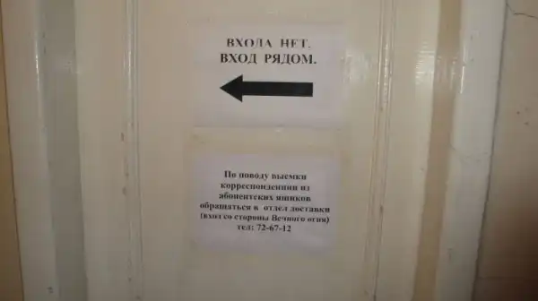 Занятная фотоистория о том, как одна женщина намеревалась попасть в отделение "Почты России". Чтобы добраться до заветного места выдачи посылок пришлось пройти настоящий квест, читая инструкции на стенах и прокладывая дорогу по указателям. Прямо дорога в царство теней какая-то.