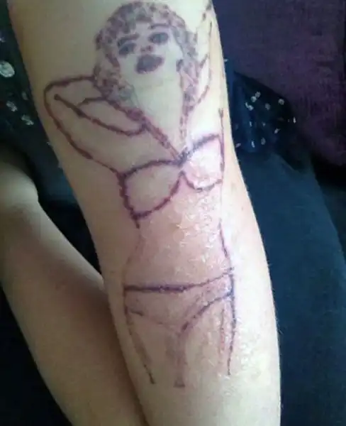 17-летний парикмахер Сиобан Филдс заплатила Дэйву Стюарту из салона Intenze Tattoos 50 фунтов стерлингов за портрет Мерилин Монро на плече. Даже фотку мастеру принесла, чтобы тому работать было легче. Татуировщик постарался на славу.