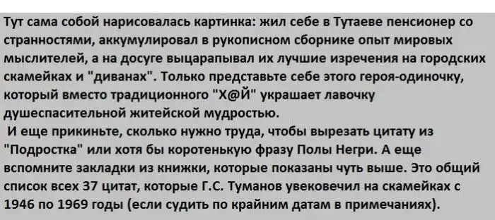 Меня всегда впечатляли люди, которые, читая, делали пометки нa полях, что-то подчеркивали, обводили. Но чтобы так! Целую книгу написать из фраз, объясняющих многое, да ещё и скамейки покрывать наглядной агитацией о пользе мыслительный деятельности! Молодец!
