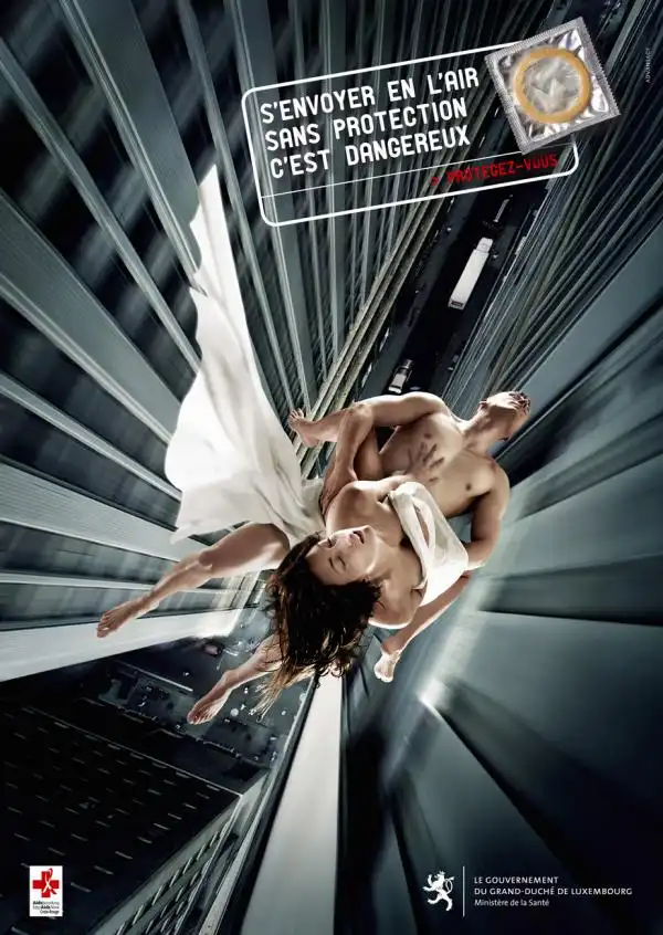«Прыгать вниз без защиты опасно» предупреждает Бельгийская реклама 2009 года.