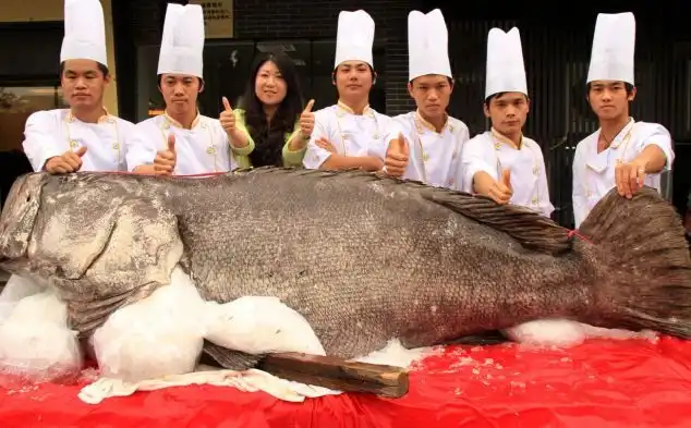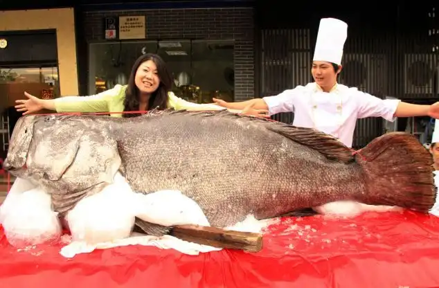 В один из китайских ресторанов доставили самого крупного из пойманных в Китае морских окуней. Он был выловлен 7 ноября в районе островов Спратли. Рыбешка действительно внушительная: длина ее составляет 2,65 метра, а вес - 341,5 кг. Представьте к тому же, что у нее 30-сантиметровый язык. В общем, пофотографировались и пустили на суши.