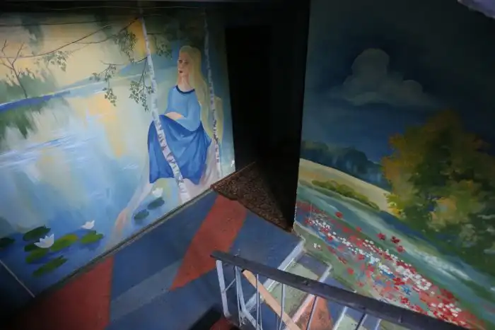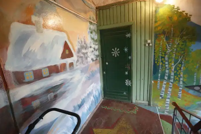 Варварские методы вызвали негодование всех соседей, которые почти десять лет собственными силами и на личные средства разукрашивали унылые стены в подъезде рисунками. Благодаря местной художнице на стенах появляются яркие городские пейзажи.