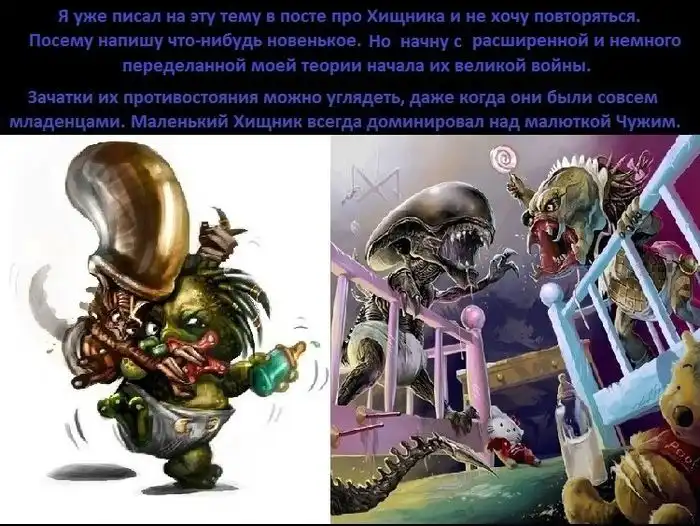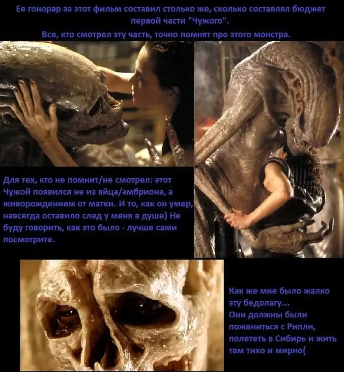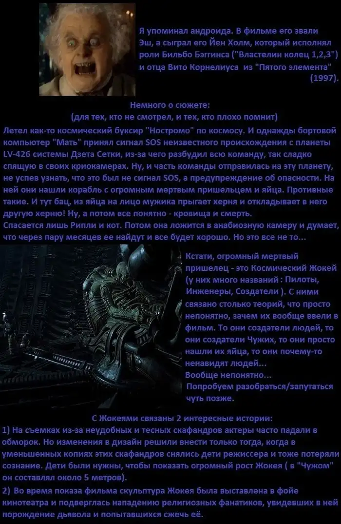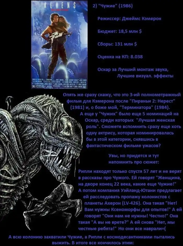 Я читал 2 часть она полностью повторяет фильм с одним ОГРОМНЫМ НО. Половина глав написана от лица чужих, с помощью которых мы узнаем что они древняя высокоразвитая цивилизация покорившая космос до появления людей. Помню что для меня было откровение осознать что чужие не монстры. Просто мы их не понимаем ведь они совершено другие не гуманоиды. Их психика, восприятие бытия и все формы коммуникаций все виды потребностей все другое чуждое нам. Кстати одно из повествований идет от лица чужого которого задавила Рипли на транспортере когда убегали) На сколько я помню мотивировало убивать людей сугубо размножение и препятствие угрозы вымирания они не жрали людей а брезгали нами на этом акцентировалось в книги внимание что им противно нас убивать и мы им вообще мерзко противны. Вот такие дела:) Гигер как я слышал нарисовал чужого до фильма для выставки сюрреализма.