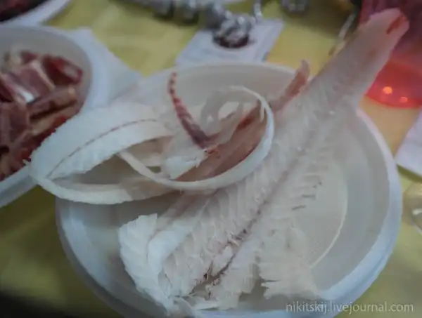 Пишет Сергей Никитский: “Хочу вам рассказать про один из лучших деликатесов в мире – про якутскую строганину. Строганина — свежезамороженая рыба или мясо, одно из основных блюд северной кухни (популярна в северорусской, якутской кухне, кухне коми).