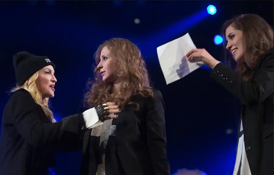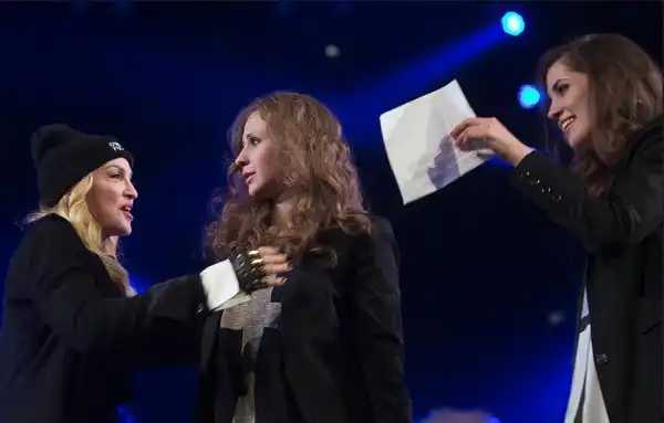 Бывшие участницы Pussy Riot Надежда Толоконникова и Мария Алехина вышли на сцену нью-йоркского Barclays Center на концерте, организованном Amnesty International. На сцене их представила Мадонна. Девушки выступили с политической речью, в которой потребовали освобождения политических заключенных. В свою очередь анонимные участницы Pussy Riot потребовали не называть Алехину и Толоконникову действующими членами арт-группы.