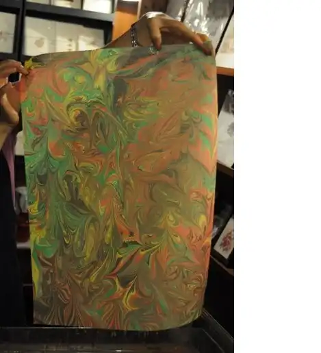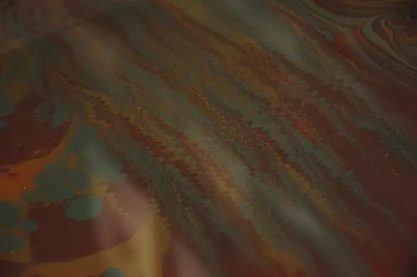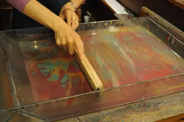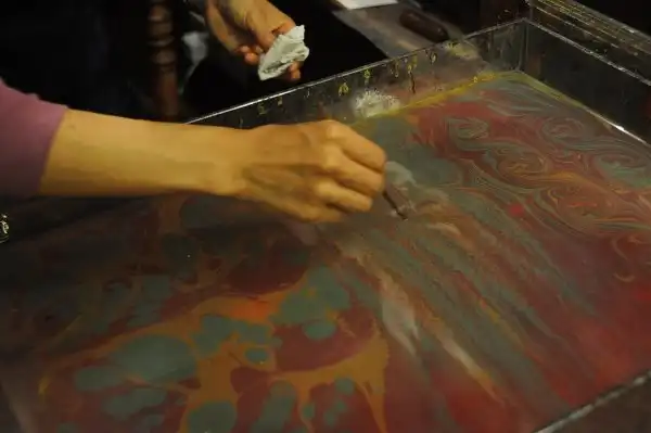 На следующем этапе мастер перемешивает краски, создает из них узоры.