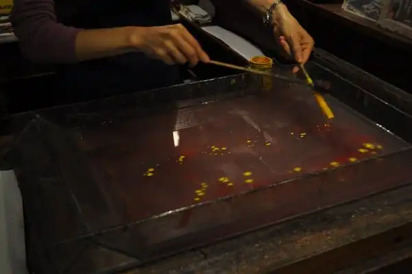 Мастер убирает излишки воды и краски - проводит листом по пруту. Краски уже закрепились, узор не смажется.