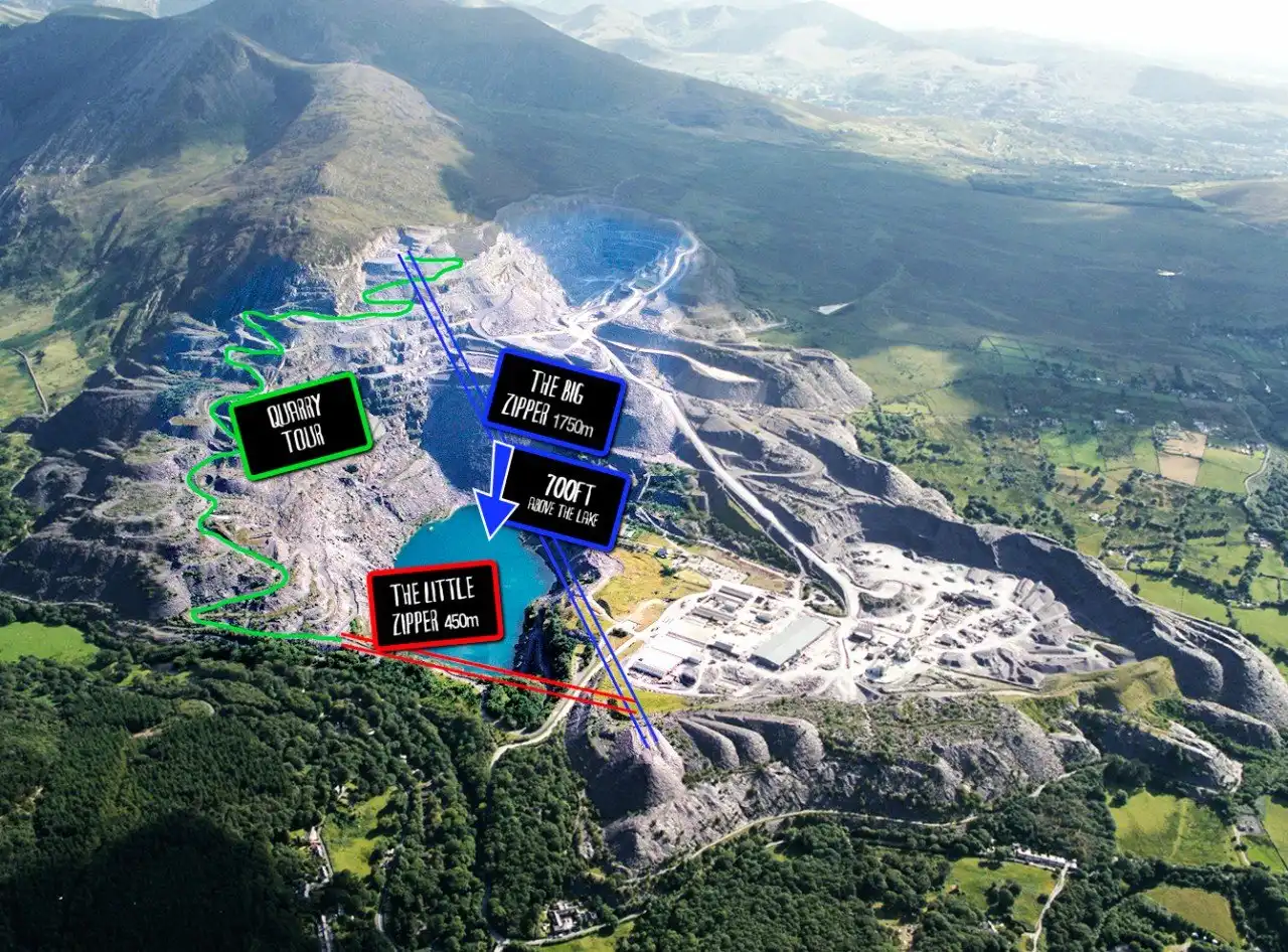 Аттракцион Zip World, расположенный в крупнейшем в мире старом сланцевом карьере, — это первый аттракцион подобного рода в Великобритании. Посетители будут подниматься на высоту более 700 футов, пролетать по воздуху над горным озером, наслаждаясь панорамным видом на Национальный Парк Сноудония (Snowdonia), в направлении острова Англси (Isle of Anglesey), а при хорошей погоде смогут увидеть даже остров Мэн (Isle of Man).