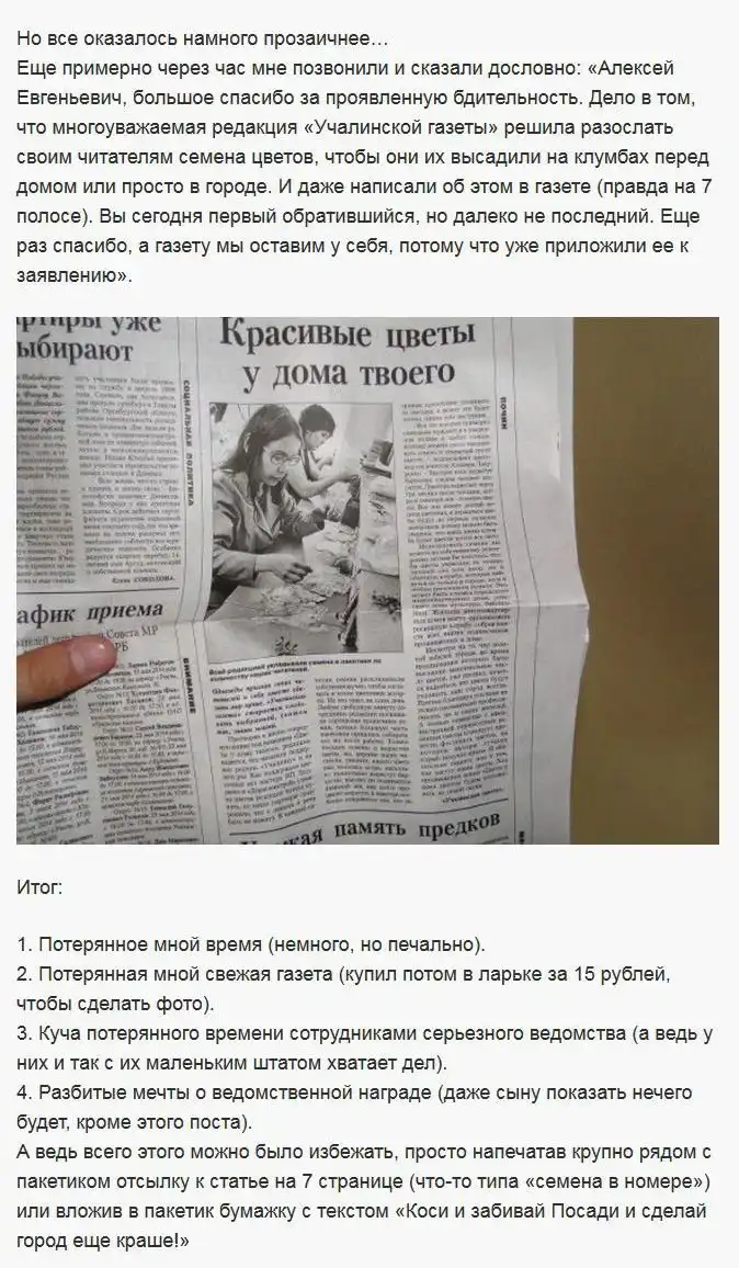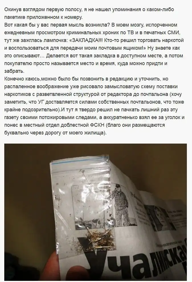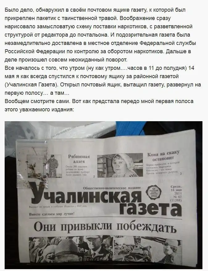 Представьте себе ситуацию: вы открываете свой почтовый ящик, достаете оттуда свежую газету, а к ней прикреплен странный пакетик с неизвестной "травой" внутри. Ваши действия? Советую к прочтению эту историю от первого лица в продолжении поста. Честно вам скажу, я очень удивился такому повороту событий, который произошел с автором.