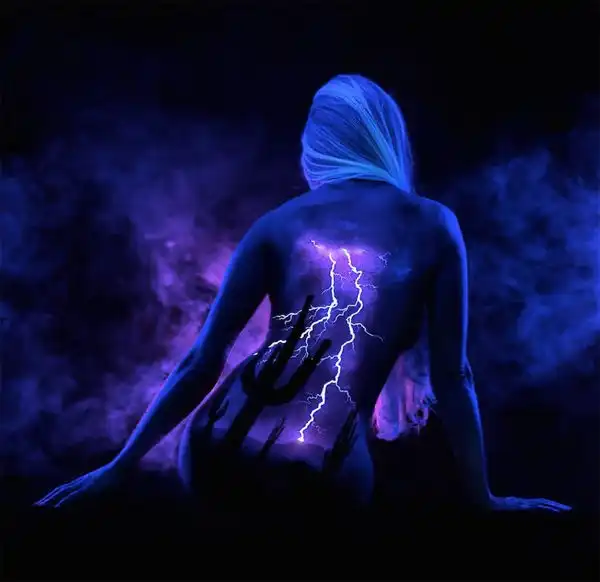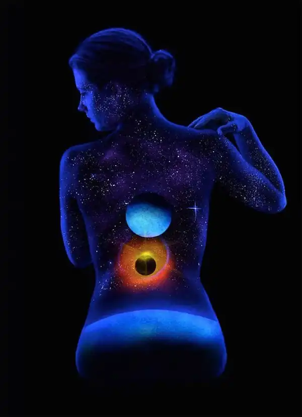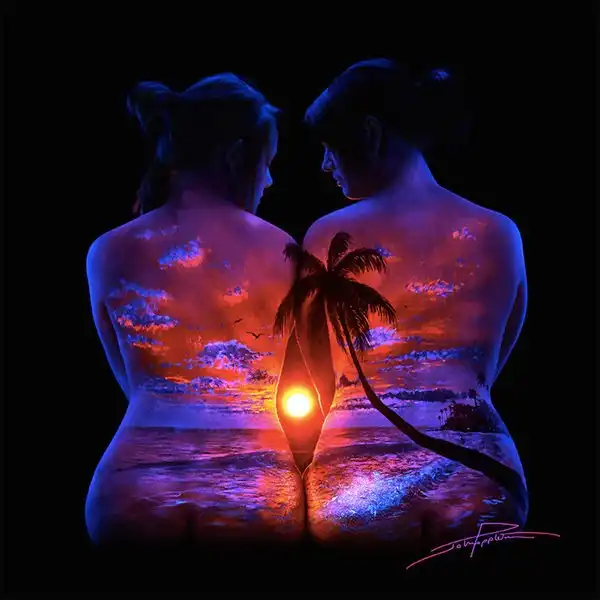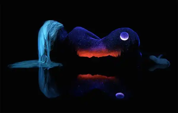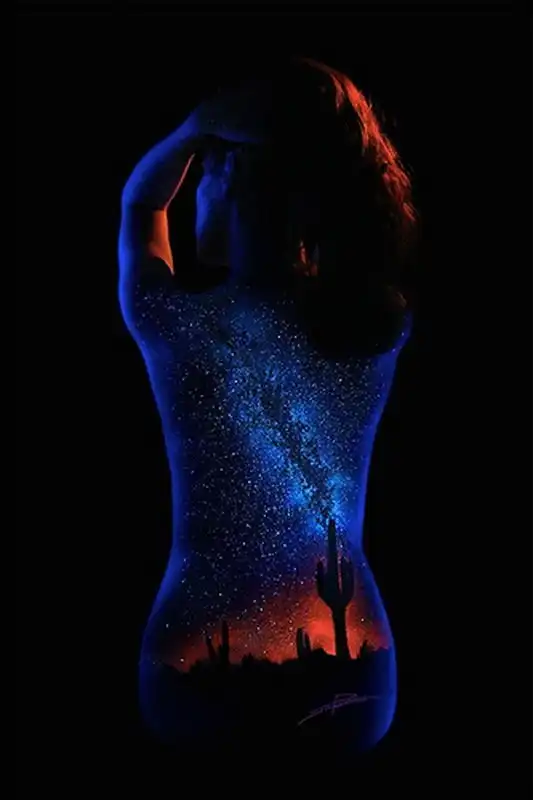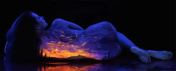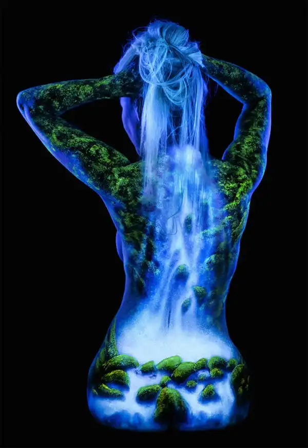 Естественную красоту женского тела фотограф и художник Джон Попплтон подчеркивает боди-артом. С помощью флуоресцентных пигментов он воплощает образ матери-природы, для передачи которого автор украшает тело живописными пейзажами.