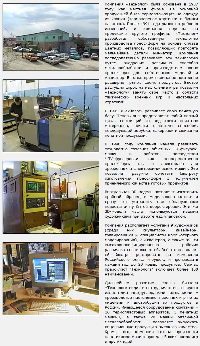 Конечно, такие сложные, изысканные системы очень и очень интересны. Но разработчики "Технолога" учли, что рынок западных настольных игр складывался десятилетиями, там ребенок с детства окружен богатейшим выбором настольных игр. Эти игры постепенно приучают его к все более сложным правилам - от про элементарных игр до изощренных макетных варгеймов, которые воспроизводят целые сражения. Такое обилие товаров, рассчитанных на самые разные возрастные группы, давно уже сформировало определенную "игровую культуру" варгеймов...