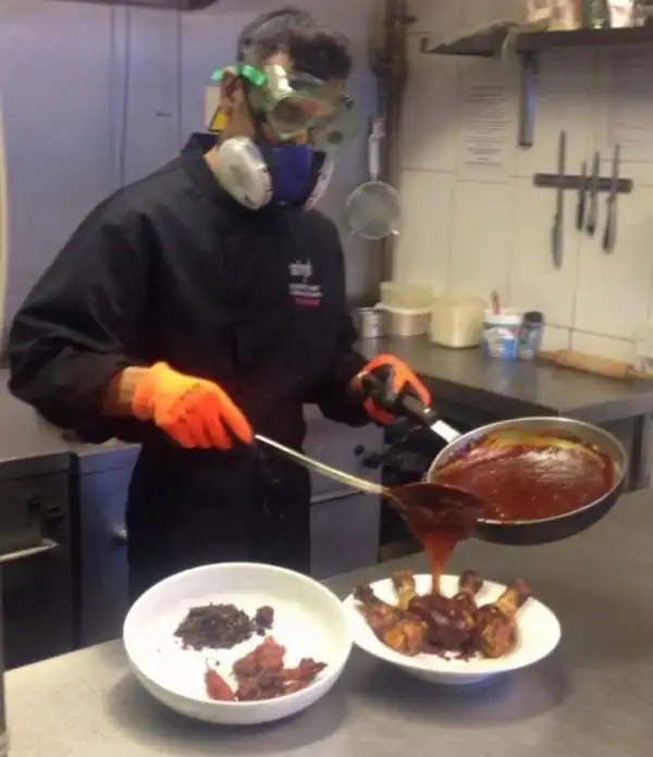 Один повар из Великобритании изобрел соус, который был назван самым острым в мире. Насколько он острый, спросите вы? Это вы узнаете в продолжении поста, но даже глядя на фото, на котором повар готовит свой фирменный соус "Atomic Kick Ass" в противогазе, становится ясно, что не каждый осмелится его попробовать ;)