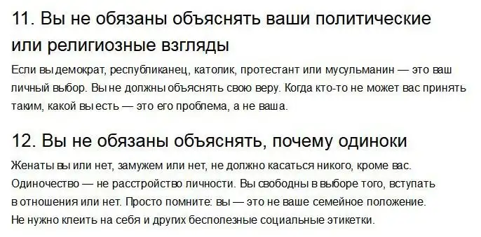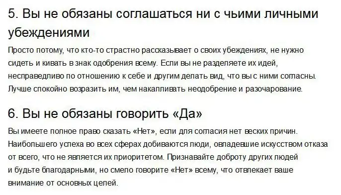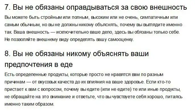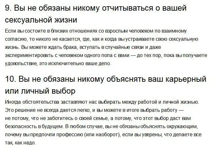 в последнее время сплошь и рядом такие "умные" руководства: тут ты не обязан, там ты не должен. но, по-моему, такие советы подходят далеко не всем. надо сначала научиться быть ответственным за свою жизнь и осознавать эту ответственность. а то начинают сопляки морду кривить - я вам объяснять ничего не обязан, это мой выбор, на ваши вопросы отвечать не хочу, живу как живется. ага. а потом проходит время: ой, а че это у вас всех все хорошо,а у меня херово? а у вас семья и дети, а я один. а почему на работе меня не ценят. и так далее.