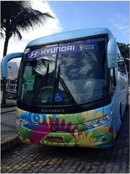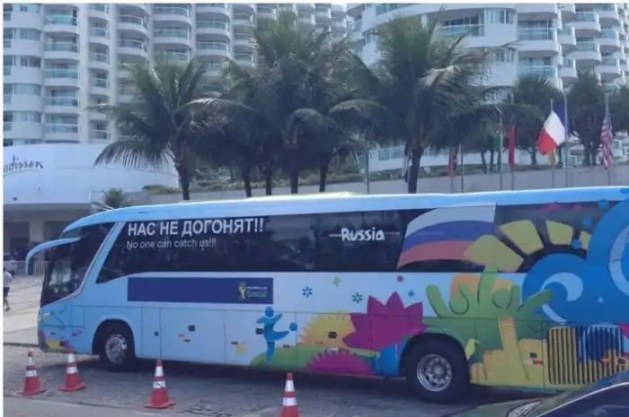 Нашёл фото автобуса, на котором передвигается наша сборная по футболу в Бразилии во время Чемпионата мира по футболу 2014. Что в нем такого необычного?