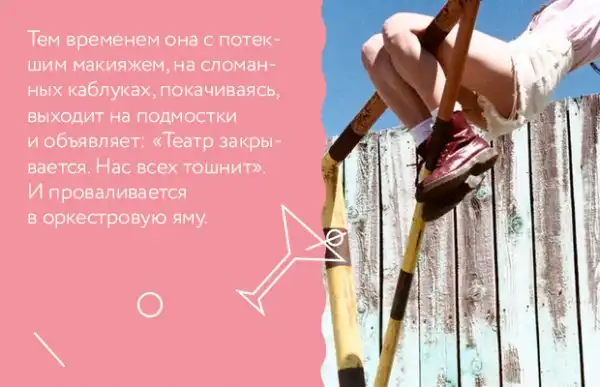 Описывать мотивы, толкающие девушку к выпивке, так же сложно, как ловить сачком подводное течение. Это течение в конце концов выносит ее на случайный берег: в магазин, а лучше — в бар. И вот она уже задумчиво осматривает равнодушные ряды бутылок. «Красивая этикетка, с такого сразу не убьет» — думает она, протягивая руку к какому-то чудовищному пойлу. По большому счету, ей не важно, что пить. Свой выбор она уже сделала. Представление началось.
