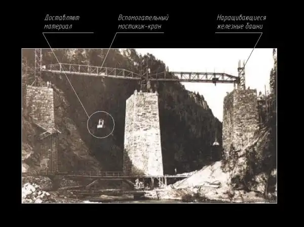 Опоры возводились без подмостей. В центре опор были поставлены железные башни, на которые опирались вспомогательные мостики-краны на 5 т. По мере поднятия опоры башен наращивались, мостики поднимались и тд….
