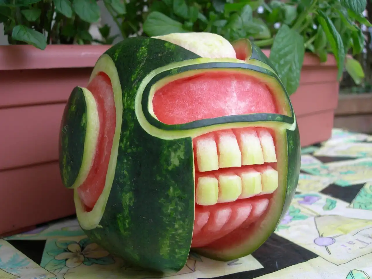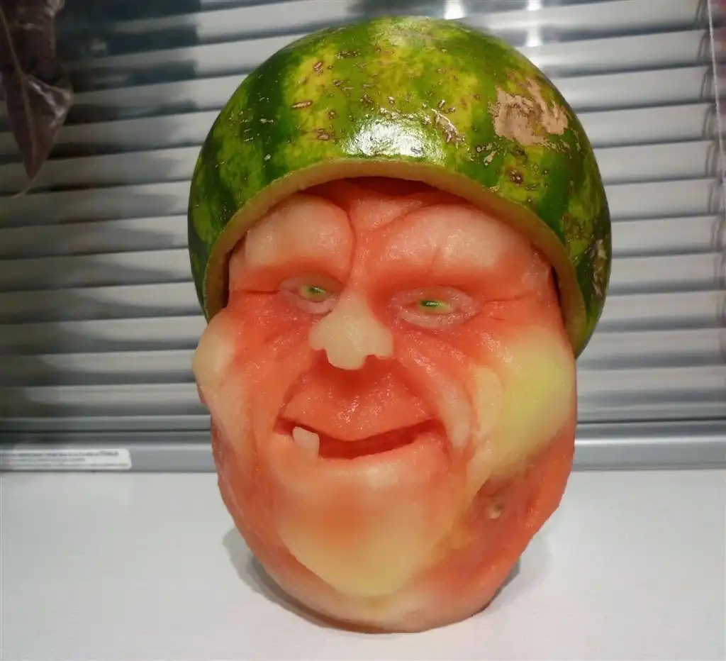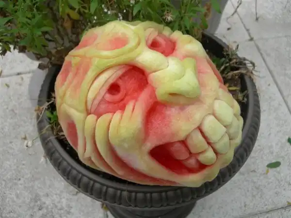 Клайв невероятно трансформирует трехслойные арбузы — умело манипулирует внешнюю зеленую кожу, белый пробковый слой и красную плоть, создавая страшную коллекцию сердитых аллигаторов,норвежских викингов, самураев и других героев.