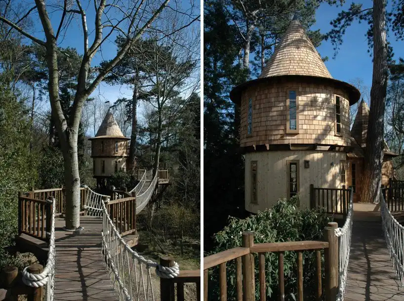 Примечательно, что дома, находящиеся на определенной высоте, связаны между собой целой сетью канатных мостиков. Крыша детского домика состоит из трех заостренных башенок, имитирующих архитектуру Средневековья. Под потолком находится небольшой люк, открывающий путь в еще одну игровую комнату. У домика для взрослых, напротив, низкая коническая крыша. Жилое пространство составляют: большая гостиная, спальня, а также ванная и кухня. Дерево расположено в центре гостиной.
