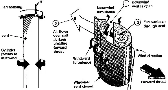 Турбопарус представляет собой полый цилиндр, снабженный специальным насосом. Насос создает разряжение с одной стороны турбопаруса, закачивая воздух внутрь паруса, наружный воздух начинает течь вокруг турбопаруса с разной скоростью и корабль начинает двигаться в перпендикулярном давлению воздуха направлении. Это очень напоминает подъемную силу действующую на крыло самолета — снизу крыла давление больше и самолет выталкивает вверх. Турбопарус позволяет двигаться кораблю против любого ветра, лишь бы хватило мощности насоса. Применяется как вспомогательная система для обычного судового двигателя. Два турбопаруса установленные на корабле команды Кусто «Алкион» позволяли экономить до 50% горючего.