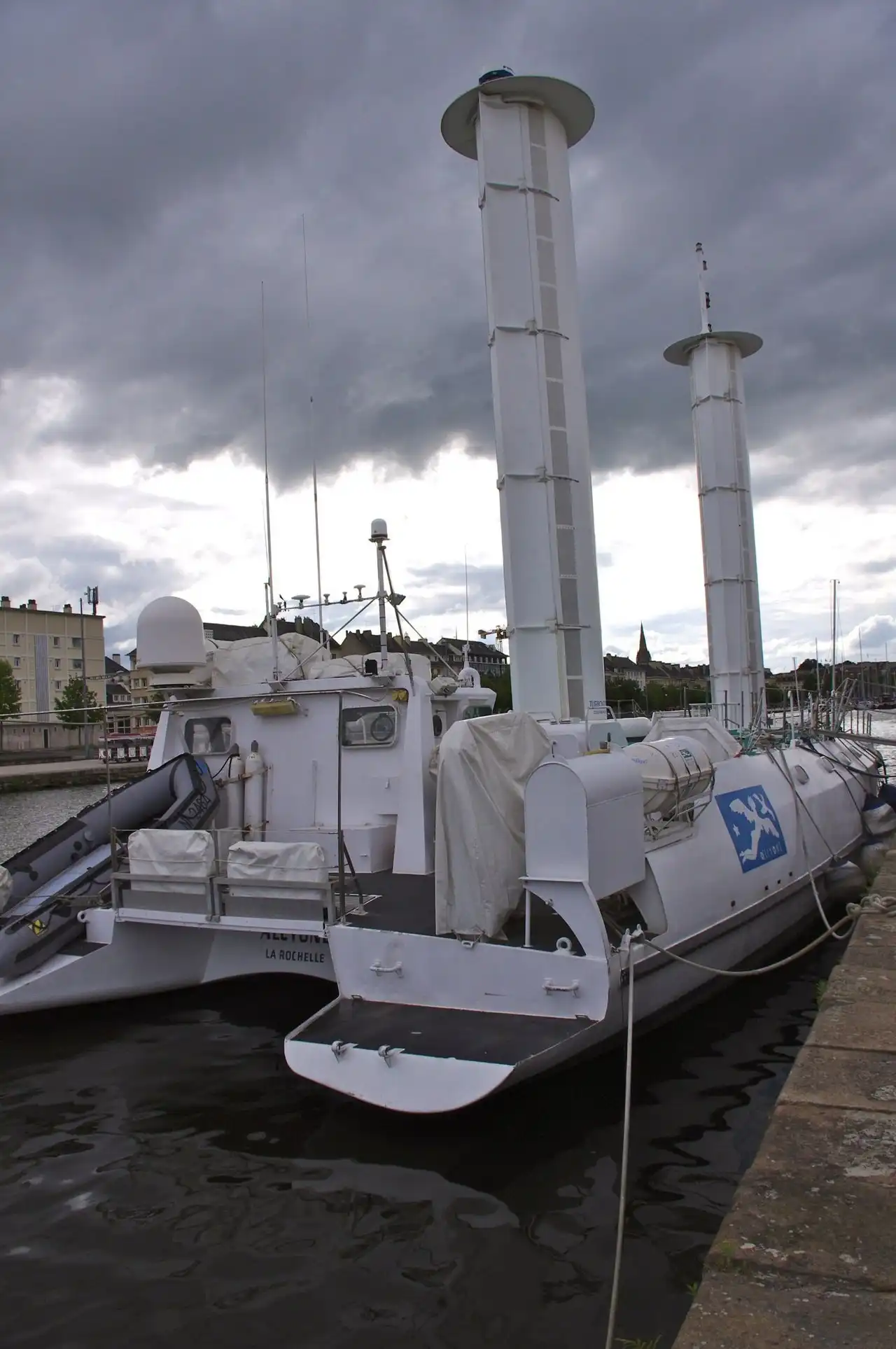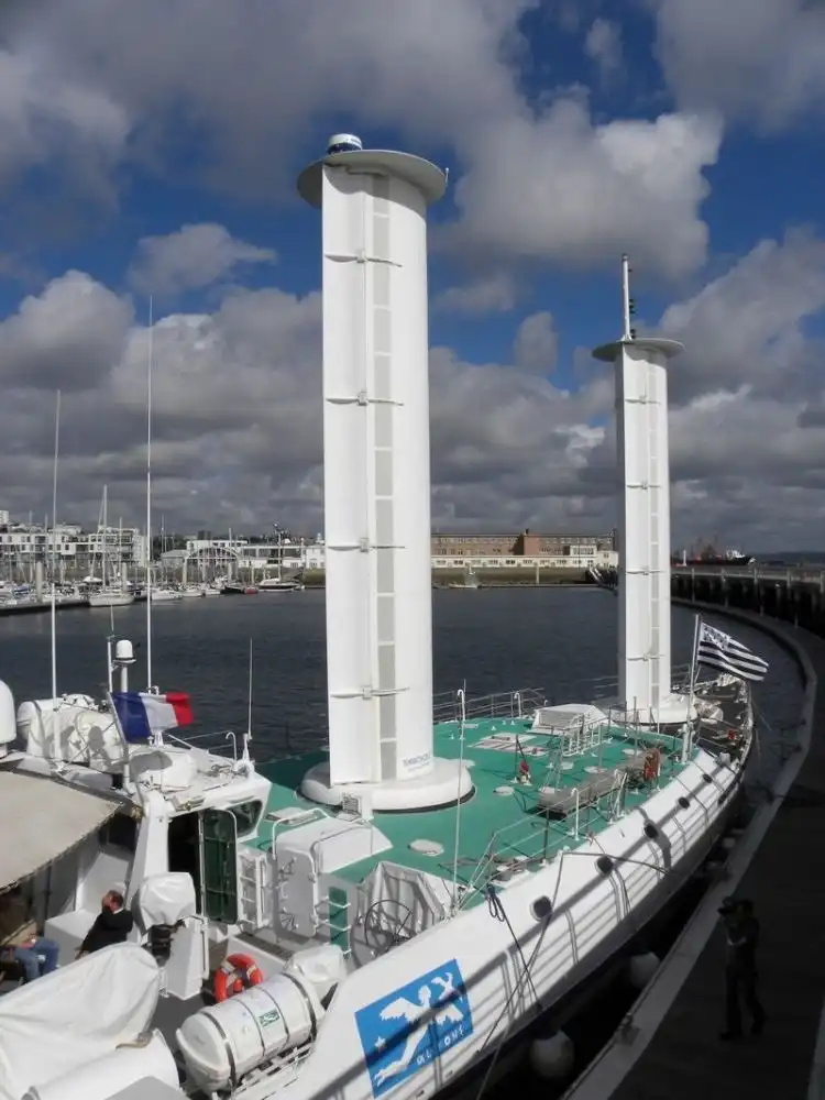 А в апреле 1985 года в порту Ла-Рошель была спущена на воду «Алкиона» — первый полноценный корабль, оборудованный турбопарусами. Сейчас она по-прежнему на ходу и на сегодняшний день является флагманом (и, по сути, единственным крупным кораблем) флотилии команды Кусто. Турбопаруса на ней служат не единственным движителем, но помогают обычной сцепке из двух дизелей и