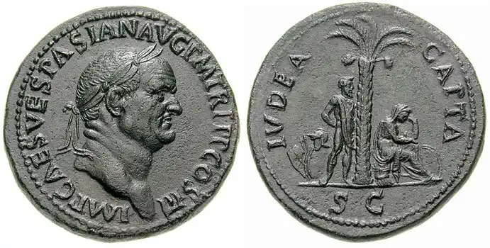 Монета императора Веспасиана, выпущенная после его победы над Иудеей. На одной из сторон изображена Иудейская финиковая пальма.