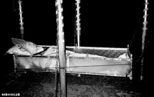 Гроб «товарищи» потащили, было в вертолет, но ноша оказалась слишком тяжела, и решили облегчить задачу путём удаления жидкости. После откачки жидкости из гроба труп прямо на глазах, на чернеть. Тогда жидкость снова залили, и чернота стала быстро исчезать. Спустя минуту на щеках покойной уже вновь заиграл румянец, и всё тело усопшей приобрело прежний жизнеподобный вид. Гроб закрыли и занесли в вертолёт, собрали вместе с землей остатки замазки в целлофановые пакетики и приказали свидетелям разойтись. После чего вертолёт взмыл ввысь и взял курс на Новосибирск.