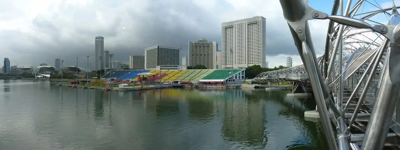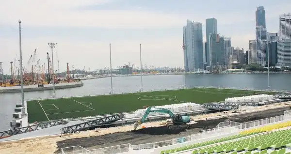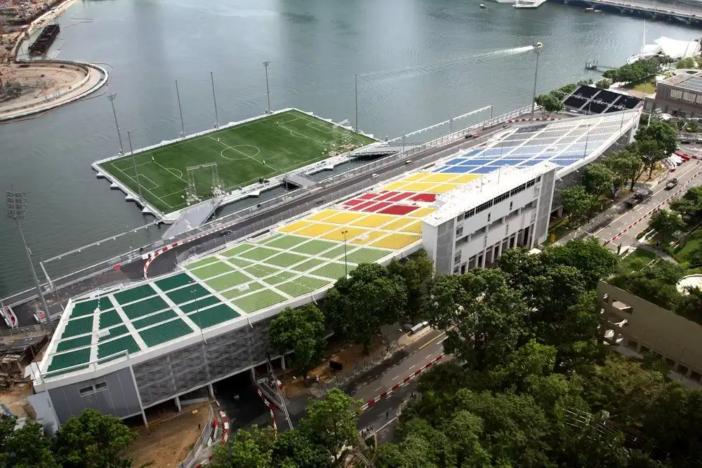 Расположенная в Сингапуре, The Float в Марина Бэй — самая большая плавающая сцена в мире. Сделанная полностью из стали, плавающая платформа составляет 120 метров в длину и 83 метра в ширину. Платформа весит 1,070 тонн и крепиться к морскому дну шестью опорами. Пассажировместимость же самого стадиона составляет 30,000 человек. Строительство на плавающей платформе началось в марте 2006. Ушло 13 месяцев, чтобы завершить строительство, и платформа была официально открыта в 2007. Сцена сделана из 15 понтонов, которые могут соединяться, как мозаика. Это делает структуру трансформируемой, чтобы удовлетворять требованиям различных событий.