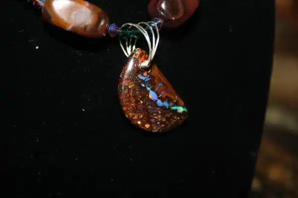 Огненный опал или болдер — полупрозрачные или прозрачные камни с цветами от винно-жёлтого до гиацинтово-красного, под определёнными углами видна игра цветов.