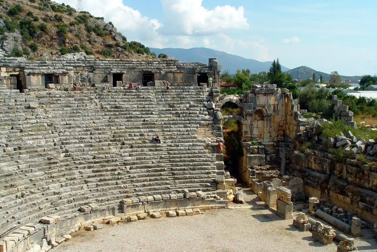 Недалеко от гробниц находится античный театр города Мира. Объясню почему этот театр считается греко-римским. Ликия была завоевана греками и именно благодаря грекам театр в Мире имеет вид классического театрального здания. Основными отличиями греческого театра является его полукруглое строение со сценой в центре, на которой и происходили представления. К сцене примыкают зрительские места. В течении своей истории театр неоднократно разрушался, подвергался землетрясению, был затоплен, но всегда восстанавливался. Через некоторое время Ликия отошла Римской Империи. Римляне достраивали театр и внесли в его конструкцию и оформление некоторые штрихи. Именно поэтому театр считается греко-римским.