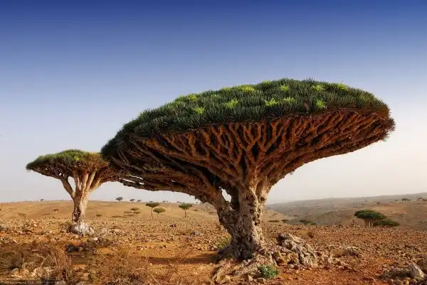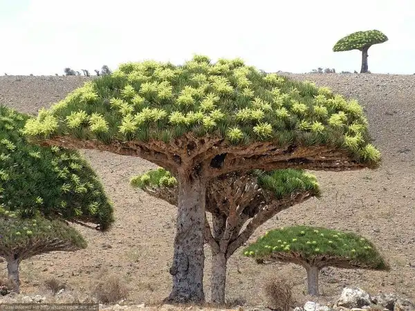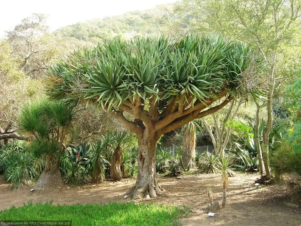 Если вы сделаете надрез на стволе драконового дерево, дерева выделит липкий красный сок, который и дал ему название (греческое слово drakaina означает дракон). Настоящее драконово дерево растет на Канарских островах, но, к сожалению, оно стало очень редким в результате сбора красной смолы. Древние выжившие экземпляры все еще встречаются то здесь, то там. Возраст самого старого дерева, поваленного ветром в 1868 году, был определен в 6000 лет, хотя, вероятно, оно было много моложе.