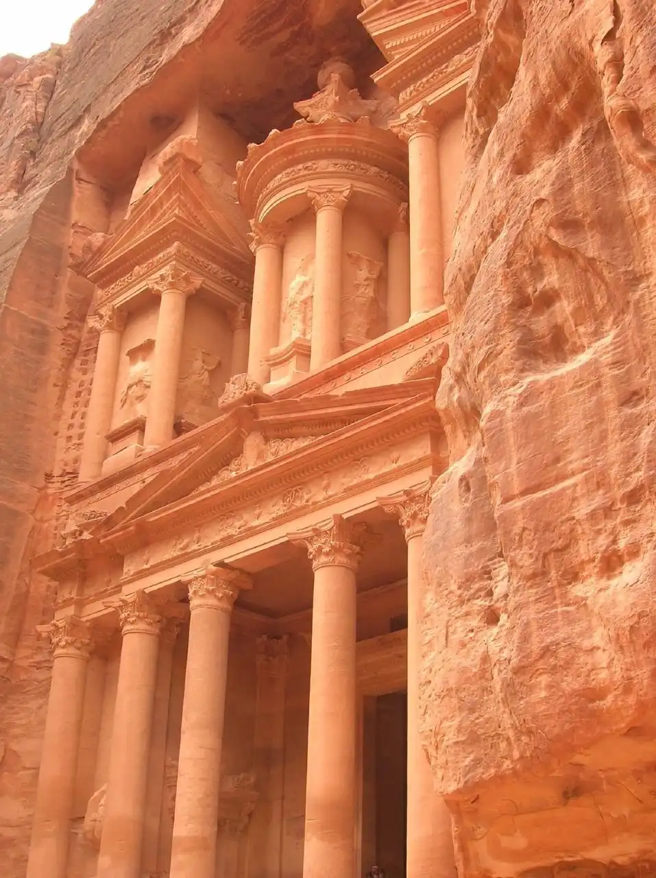 Снизу видна лишь узенькая полоска неба. Гид не предвосхищает событий, держа в тайне момент появления Петры. И в конце ущелья мы оказываемся захваченными небывалым зрелищем – взору открывается главный памятник Петры, Казнат эль Фарун –«Сокровищница Фараона». Это один из ярчайших примеров набатейского искусства резьбы по камню. Богато украшенный резными изображениями, сорокаметровый фасад увенчан огромной урной — древним символом богатства.
