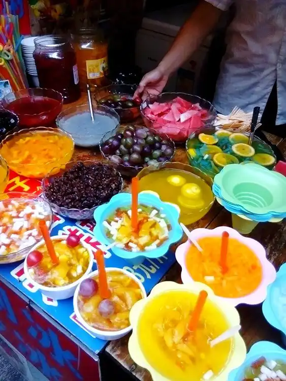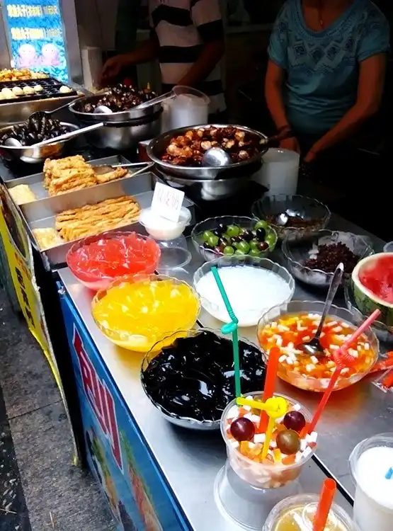 Китайские напитки из травяного и цитрусового желе, винограда, дыни и измельченного кокосового ореха.