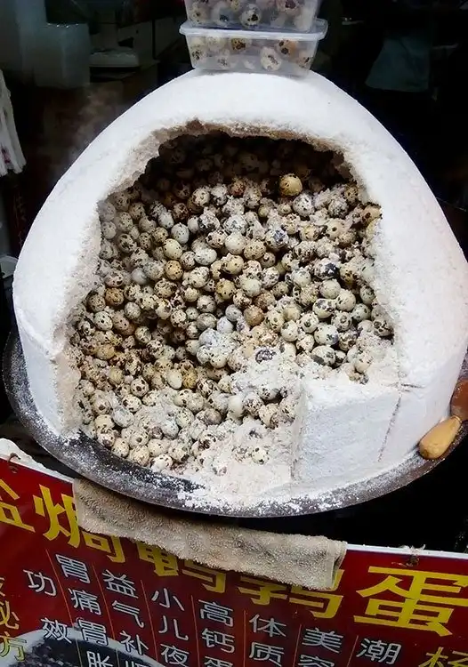 Устройство для приготовления представляет собой печь, сделанную из цельной глыбы соли с большим углублением, в которое помещаются сотни крошечных перепелиных яиц. Таким образом это китайское блюдо одновременно солится и запекается.