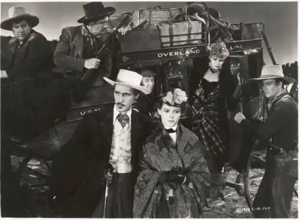 Кадр из фильма «Дилижанс». В почтовой карете путешествуют типичные для Дикого Запада персонажи: ковбой, карточный шулер, торговец виски, женщина лёгкого поведения, банкир, укравший сбережения вкладчиков, и жена офицера.