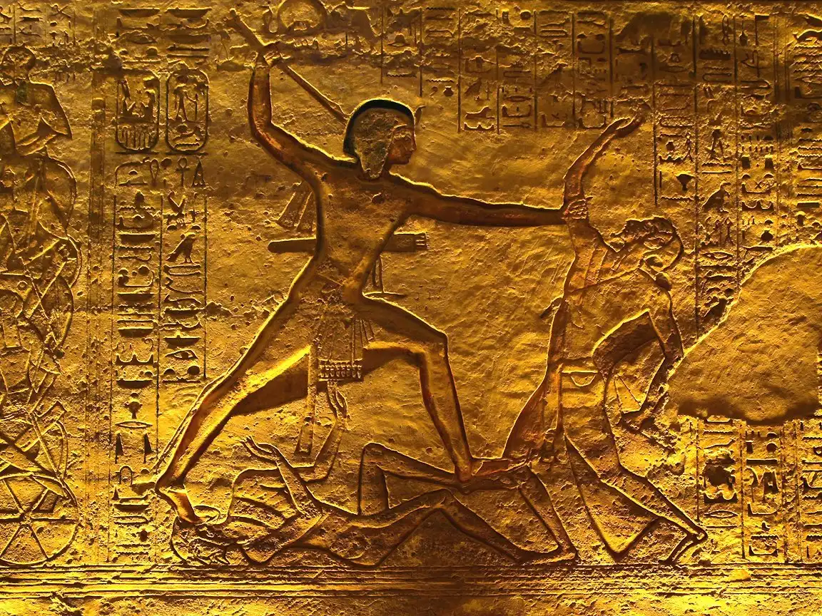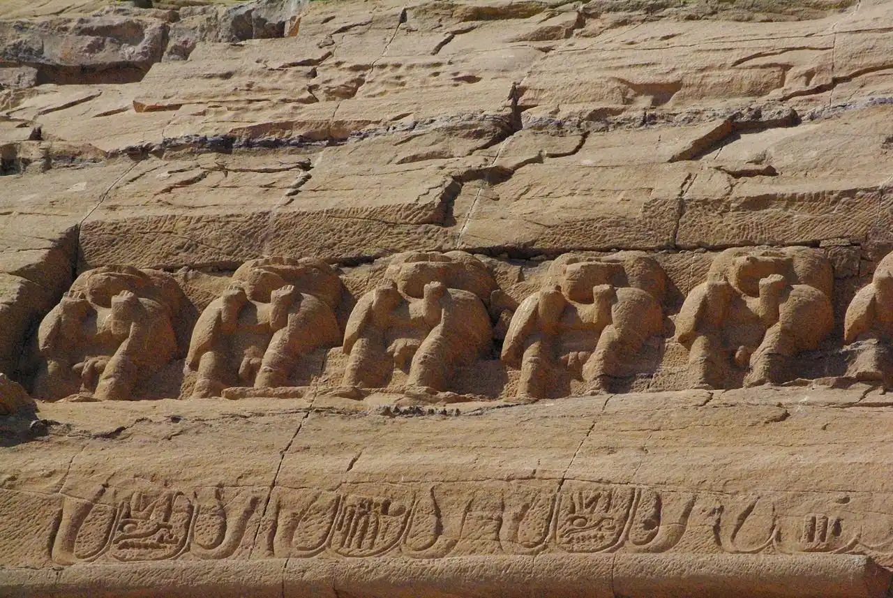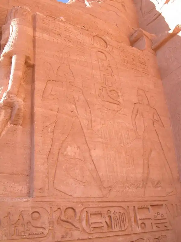 Рельефы храма Абу-Симбел выделяются своей динамикой, экспрессией движений и поз. Их авторами были фиванские скульпторы Пиаи, Панефер и Хеви. Сюжеты рельефов посвящены жизни и подвигам Рамсеса II: вот фараон повергает к стопам богов толпы пленников – белокожих ливийцев и темнокожих нубийцев, вот он безжалостно убивает их перед лицом богов… Грандиозные картины повествуют о войне Рамсеса II с хеттами. Замечателен рельеф, изображающий сцены битвы при Кадеше: мчащийся на колеснице фараон резким движением натягивает лук, целясь в перепуганных врагов; на стенах вражеской крепости кипит бой, со стен валятся поверженные воины; пастух поспешно угоняет скот, боясь, что он станет добычей египтян. Беспомощно поднятой рукой пастух как бы пытается загородиться от грозящей опасности…
