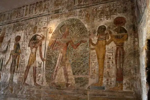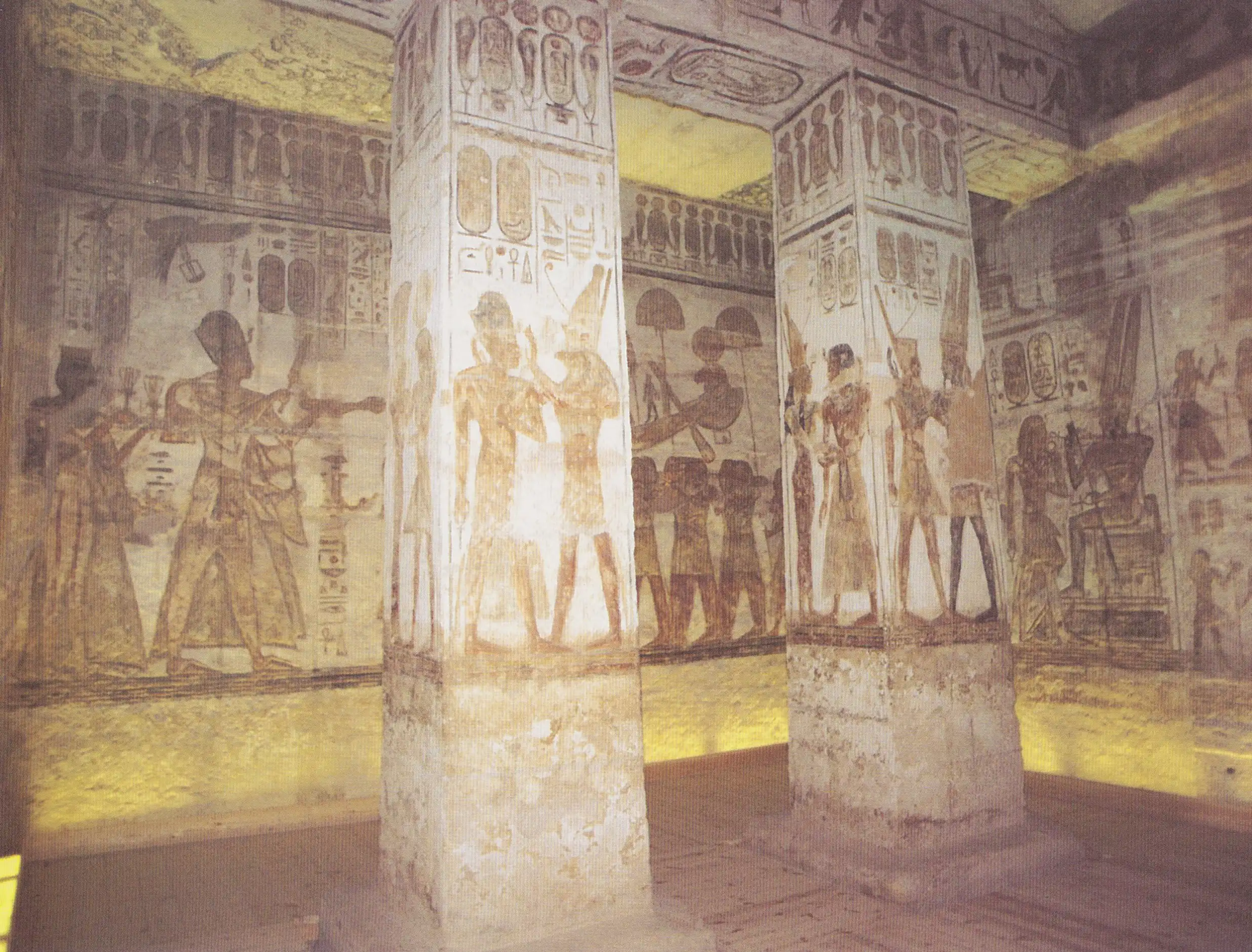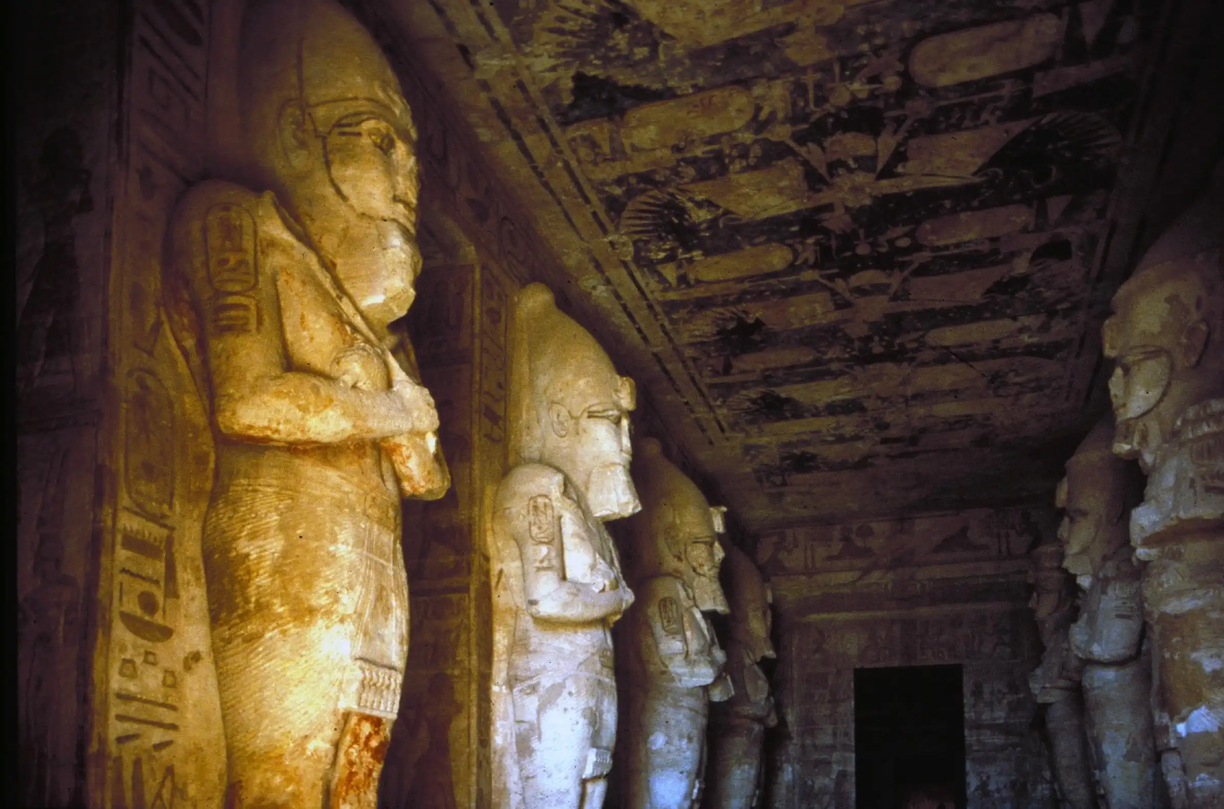 Образ великого фараона господствует в храме Абу-Симбел. Сразу же за дверями, в первом помещении храма, посетителя встречают восемь фигур фараона Рамсеса в облике бога Осириса. Они стоят по четыре с каждой стороны. Стены и потолки внутренних помещений храма покрывают росписи и раскрашенные рельефы, относящиеся к лучшим образцам искусства Древнего Египта позднего периода.