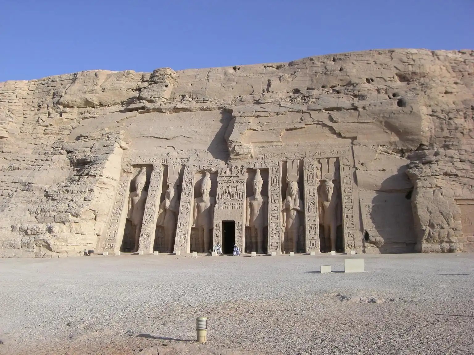 Малый храм Абу-Симбела посвящен богине Хатор. Он намного проще и скромнее, чем Большой, и состоит из высеченных в скалах колонного зала и святилища с тремя нишами. Фасад Малого храма украшают шесть фигур, выполненных в полный рост. Между статуями фараона Рамсеса II здесь помещены статуи его супруги Нефертари-Меренмут. Скульптуры стоят в глубоких затененных нишах, благодаря чему в лучах солнца создается игра света и тени, усиливающая впечатление от этих монументальных фигур. На одной из колонн Малого храма высечена надпись: «Рамсес, сильный правдой, любимец Амона, создал это божественное жилище для своей возлюбленной супруги Нефертари».