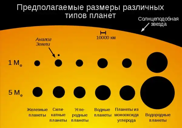 По массе все планеты делятся на 3 типа: гиганты (такие, как Юпитер и Сатурн), нептуны (такие, как Уран и Нептун) и планеты земного типа, или земли (такие, как Земля и Венера). Граница между гигантами и нептунами проходит по линии появления в недрах планет металлического водорода (около 60 масс Земли или 0.19 масс Юпитера). Граница между нептунами и землями довольно условно проведена по 7 массам Земли (просто потому, что Уран с его 14 массами Земли - еще явный нептун, а Земля - уже явно планета земного типа). Возможно, в интервале 3-10 масс Земли существуют планеты, чьи свойства резко отличаются как от свойств нептунов, так и от свойств планет земного типа, но пока они реально не открыты, не будем умножать сущности сверх необходимых.