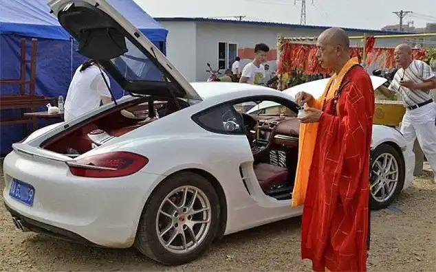 Бизнесмен из города Сяогань пригнал свой новенький Porsche к буддистскому монастырю, чтобы освятить его. Чтобы вы понимали, буддизм отрицает деньги как ценность, как и православная церковь. Но если наши священники запросто дерут бабло "на нужды церкви", освящая все, что клиент пожелает, то у буддистов с этим очень строго.