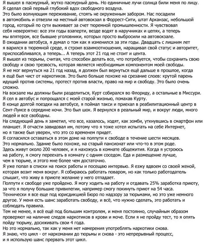Интересный рассказ американского заключенного, которого выпустили на свободу после 21 года тюремного заключения, и он попал в современный мир, кардинально изменившийся за последние 20 лет.