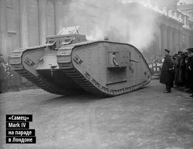Британский тяжелый танк. Оснащен пулеметами Льюиса. «Самцы» были дополнительно вооружены двумя 6-фунтовыми пушками Гочкиса. На Mark IV впервые применялась фашина — несколько трехметровых балок на цепях, которые перекидывали через рвы, чтобы облегчить прохождение машины. Также Mark IV был оснащен балкой для самовытаскивания. Использовался почти исключительно во время Первой мировой войны. После провала под Пашендалем боевые машины были несколько реабилитированы в битве при Камбре, в которой участвовало 460 танков.